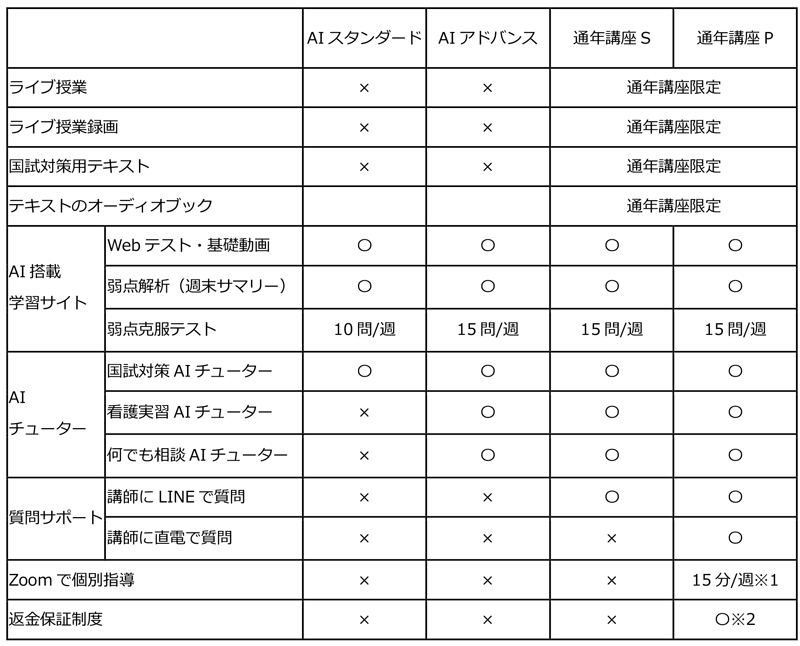 国家試験合格に必要な「学習量・学習管理・弱点補強」を、AIチューター+講師サポートで年間を通して行うスタンダードプランです。受付開始受付中開講日2026年3月1日から116回看護師国家試験当日学習内容…